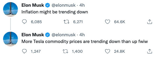 特斯拉创办人马斯克推文表示:通膨可能要削弱了,更多特斯拉的商品价格可能会更便宜。