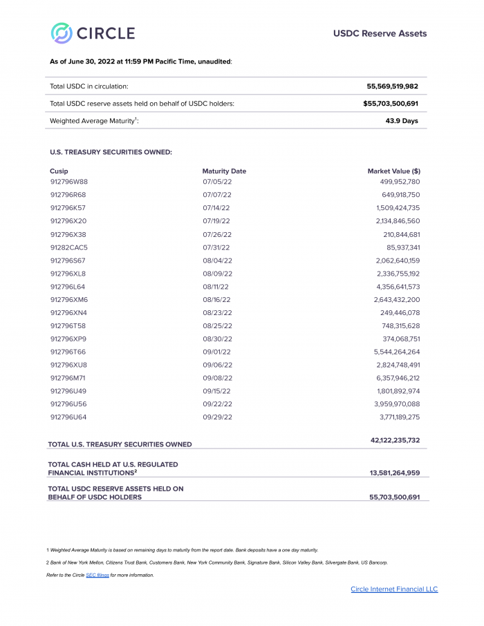 本周四,Circle Internet Finacial 发布了一份尚未经过审计的 USDC 储备资产明细报告。博客文章指出:截至 6 月 30 日,该公司持有 421 亿美元的短期(三个月内)美国政府债券 —— 最近到期时间为 9 月 29 日 —— 以及 136 亿美元的现金。