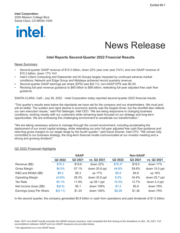 言归正传,总体而言,Intel 在 2022 年 2 季度的营收下滑了 22%(至 153 亿美元)。